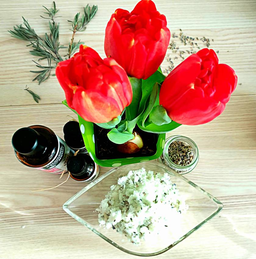 A szódabikarbónát, citromsavat, keményítőt, a szárított növényeket és a sót összekevertem egy tálban. A folyós kókuszzsírhoz hozzáadtam az általam kiválasztott gyógynövény- és illóolajakat, a mi esetünkben a rózsa-, körömvirág- és ligetszépeolajat, de bármi lehet, ami számodra szimpatikus vagy a saját bőrproblémádnak megfelelő. Végül a nedves hozzávalókat hozzáöntöttem a szárazakhoz és kézzel jól összedolgoztam őket.
