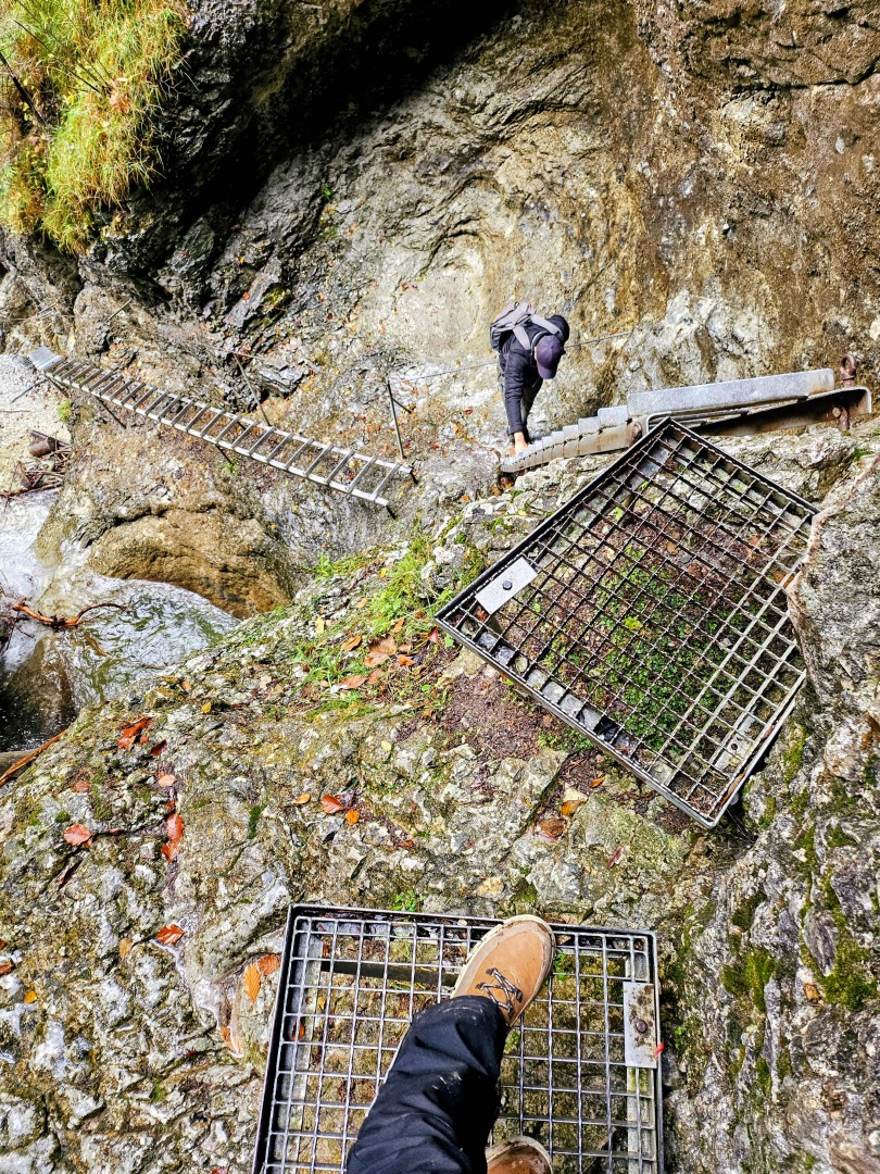 A szurdok mélyén aztán megkezdődött az igazi erőpróba! Amíg addig eljutottunk sem gondoltam, hogy sétagaloppozunk, de ami azután jött, arra nem igazán voltam felkészülve, még úgy sem, hogy láttam a képeket a szurdokról. Mert egészen más a képernyőn keresztül nézni és megint teljesen más ott állni egy hatalmas égbe törő vaslétra előtt, ami mellett egy vízesés robajlik. Valójában leírhatatlan az élmény. Egyszerre volt lélegzetelállítóan gyönyörű, hihetetlenül izgalmas és embertpróbálóan fárasztó. Ráadásul nálunk Gergő tériszonyos… szóval neki külön kihívást jelentett a túra létrás része. Itt egyébként Dávid szája is legörbül kissé és félősen jelentette ki, hogy ő képtelen felmászni. Ez nálunk merőben szokatlan, mert Dávid az, aki minden kalandban 100%-ig benne van és általában a félelem szele sem suhintja meg. Mivel tudtam, hogy vissza nem mehetünk, így az első kijelentése után a kezembe vettem a dolgokat, mert éreztem, hogy itt és most az én lélekjelenlétemen múlik minden: nem hagyhattam, hogy eluralkodjon rajta a pánik, ezért kedves, de határozott hangon arra kértem, hogy másszon. Amikor elindult felfelé a létrán, szorosan másztam mögötte és folyamatosan biztattam, beszéltem hozzá. Szerencsére nagyon hamar átbillent és pár létrafok után már simán ment a dolog. Nem is tudom, hogy mi lett volna, ha nem így történik, ugyanis az első létrás próbatételt hasonlók követtek. De a létrák mellett ezen a szakaszon akadtak sziklába vájt fémtálcák, szűk járatok és vízszintes pallók bármiféle kapaszkodó nélkül (ez számomra is kihívást jelentett, mivel szuper az egyensúlyérzékem). A túra közepén így mást sem csináltunk, mint másztunk, kapaszkodtunk a sziklák peremén vagy egyensúlyoztunk, ahogy tudtunk. Aztán egyszer csak ez a szakasz is véget ért…