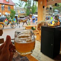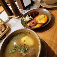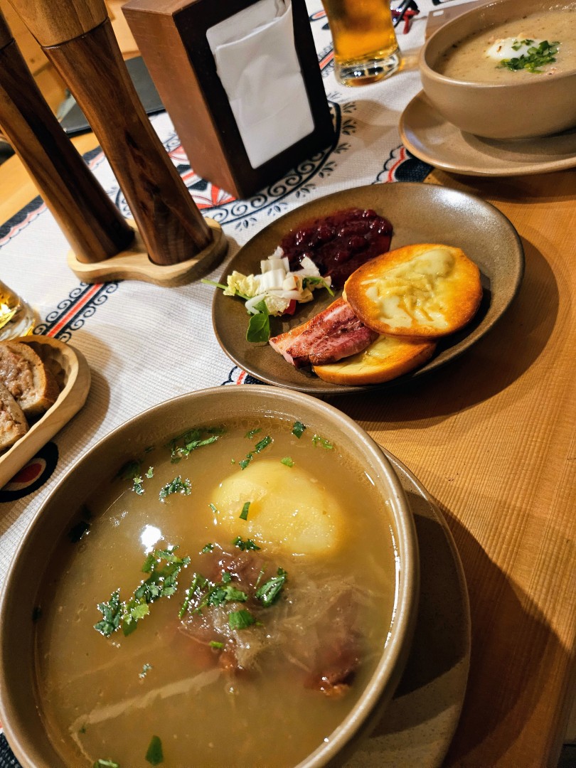 S bár mire visszaértünk a városba, már alig álltunk a lábunkon mégis minden lépés megérte. A legbüszkébb természetesen Dávidra vagyok, aki 8 évesen hajtotta végre ezt a bravúrt, és aki csak lefelé menet szontyolodott el kicsit, mivel akkorra már tényleg nagyon elfáradt és a sportcipőben való botorkálás sem könnyítette meg a dolgát – bevallom, a mienket sem. Amikor leértünk Zakopanéba szinte az első helyre beszédültünk. Alig vártuk, hogy kicsit megpihenjünk és együnk egy jót, mielőtt vissza sétálunk a szállásra. Lengyelországban nagyon tetszenek az autentikus fából készül – vagy olyan hatású – épületek, a faberendezések és valahogy az egész enteriőr. Persze ezek valószínűleg télen még hangulatosabbak, de azért más évszakokban is különleges atmoszférával bírnak. Ezen az estén én egy jó forró, de tápláló levesre vágytam, utána pedig egy kis almás süteményre vaníliafagyival, Gergő szintén levest evett, majd a lengyelek híres sajtját, az oscypeket grillezve, lekvárral. Elsőre fura párosításnak tűnhet ez a kombó, de higgyétek el, valami isteni finom.
