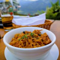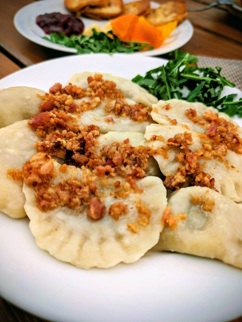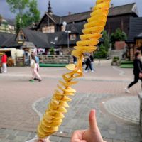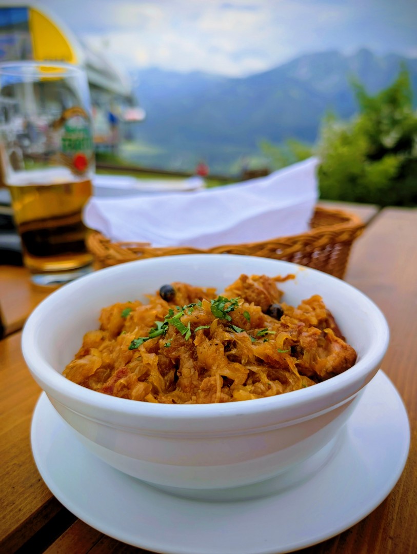 A könnyű séta kategóriát mi már a megérkezésünk napján letudtuk, amikor megnéztük magunknak a Zakopane fölé magasodó Gubałówka-hegyet. Ahogyan a legtöbben, mi is siklóval jutottunk fel a csúcsra, ahol nem csupán a kilátás volt lélegzetelállító, de egy komplett szabadtéri "élményközpont" is várt minket: mindenfelé éttermekbe és kirakodóvásárba botlottunk, szóval ez egy olyan hely, ahol nem annyira a természetközeliség, mint inkább a hangulat és a gasztronómiai élmények dominálnak. Persze mi is engedtünk a csábításnak és az első vacsoránkat itt ejtettük meg egy csodálatos panorámával rendelkező étterem teraszán. Gergő bigost evett, ami egy sűrű, káposztás egytálétel (hasonló, mint a székelykáposzta), én pirogot, Dávid pedig mivel nem túl vállalkozó szellemű gasztrokalandor, így rántott csirkefalatkákat kért.