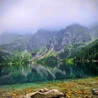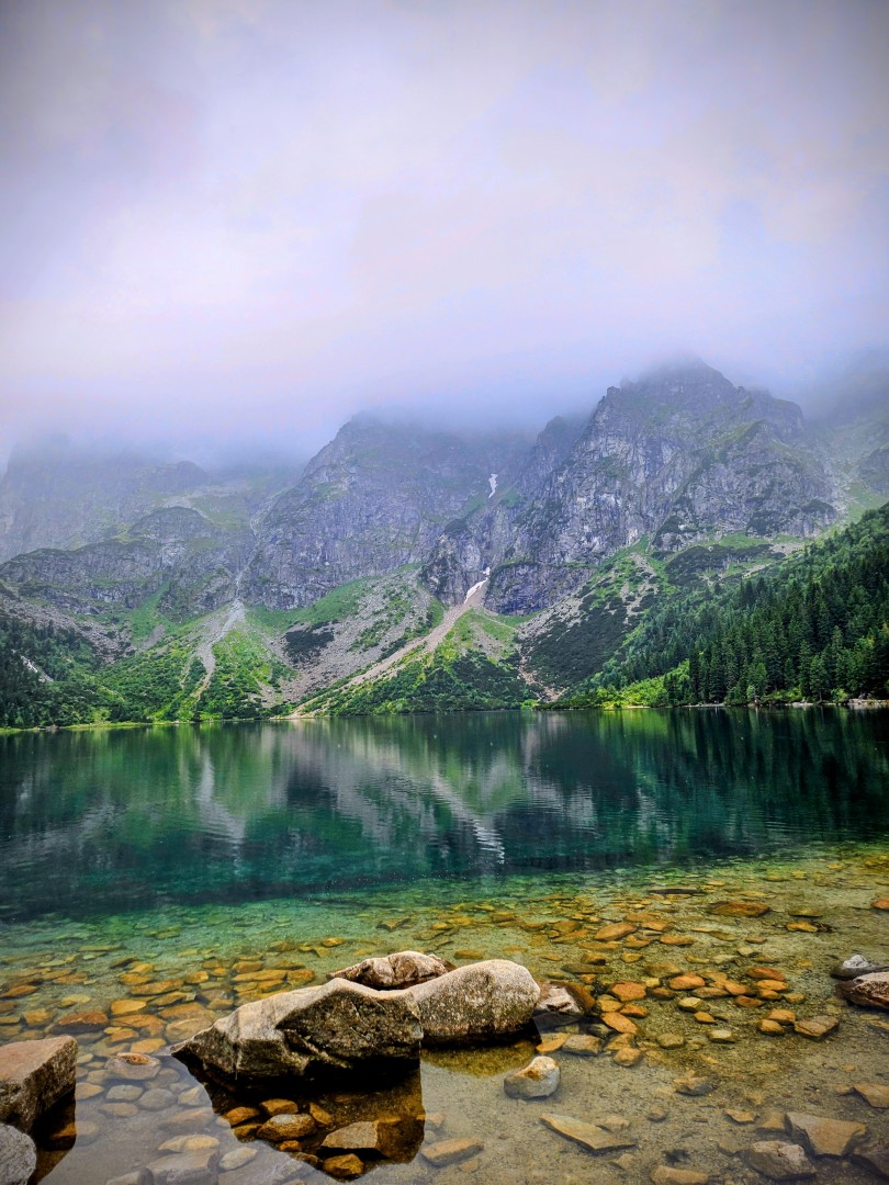 De térjünk is vissza a lényeghez, azaz a Morskie Okohoz. Ha egy szóban kellene összefoglalnom, akkor azt mondanám, hogy gyönyörű és megéri a hosszú séta, hogy megnézzétek. Azt azonban muszáj hozzátennem, hogy itt biztosan nem fogjátok megtapasztalni az érintetlen természet és a vadregényes, néma táj romantikáját. Miért? Mert nem csupán az idevezető úton tolonganak a turisták, de bizony a tónál is. Legalábbis, amikor mi voltunk, akkor csak araszolva tudtunk lejutni a tópartra, ahol pedig egymást taposták szinte az emberek. Lehet, hogy ez annak is köszönhető, hogy mire felértünk, elkezdett esni az eső, így az emberek a tó turista útvonal felőli oldalán maradtak… érthető, hogy esőben keveseknek van kedvük sétálni még egy nagyot a tó mentén.